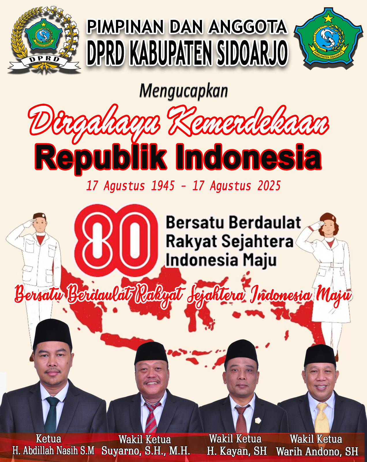 Sidoarjo, Siarpos.com – Pimpinan dan Anggota DPRD Kabupaten Sidoarjo Mengucapkan Dirgahayu Indonesia 17 Agustus 1945- 17 Agustus 2025, Bersama Berdaulat Rakyat Sejahtera Indonesia Maju.